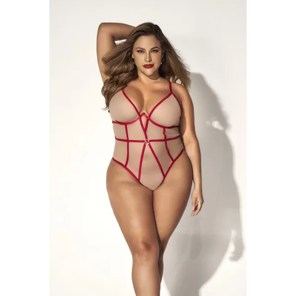 So Sexy ! Ce body sophistiqué et raffiné pour grande taille. Résille couleur chair, accentué par des coutures rouges. Body à armatures pour un meilleur soutien et petit cœur en métal sur le devant. Bretelles réglables. Body String...couverture brésilienne. Fermeture à l'entrejambe réglable.