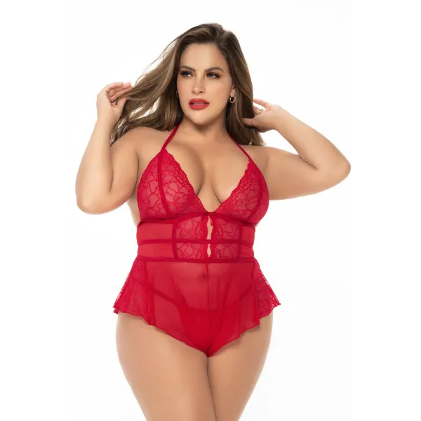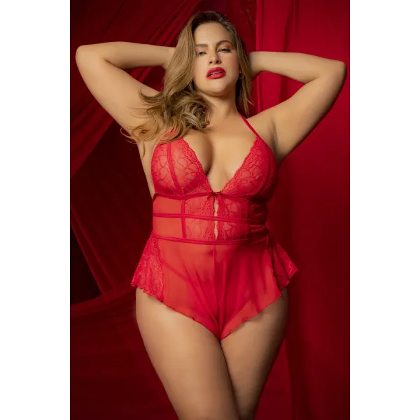 Body rouge, grande taille, dans un style babydoll avec attaches dans le dos, laçage autour du cou et string assorti inclus.