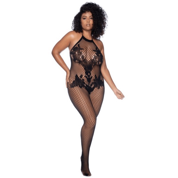 Combinaison grande taille en résille noire avec ouverture à l'entrejambe et dos nu