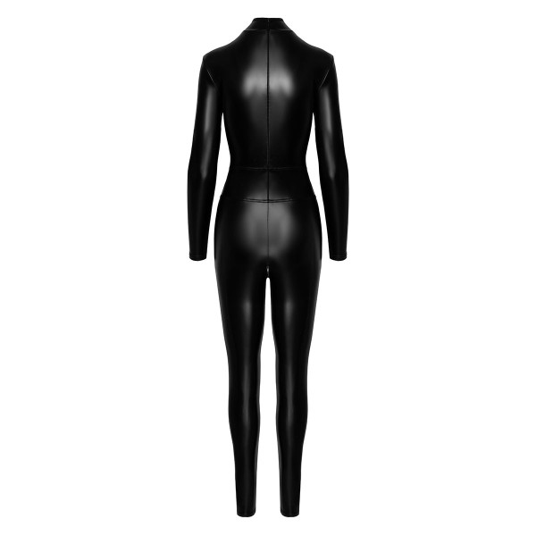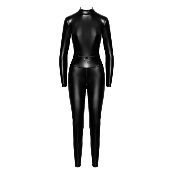Une combinaison intégrale en wetlook à la belle coupe cintrée, avec de multiples zips et un anneau BDSM cousu sur le nombril.