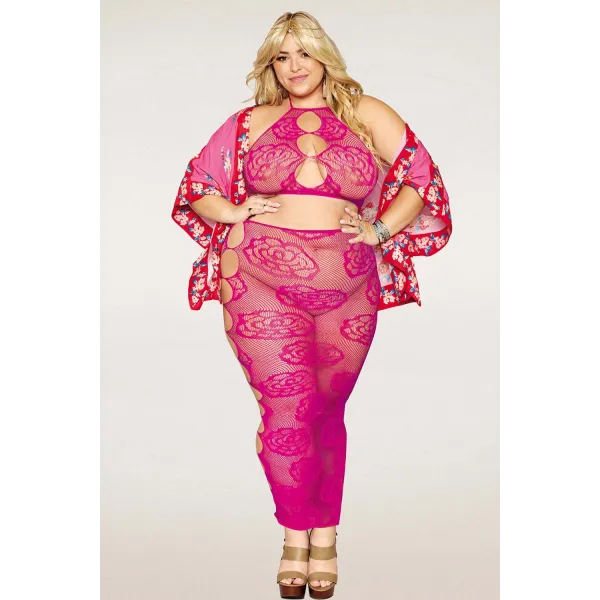Ensemble lingerie en filet, grande taille, composé de son soutien-gorge bandeau en résille fille rose et de sa jupe longue sans couture avec grand motif rose et résille. Dos nu r