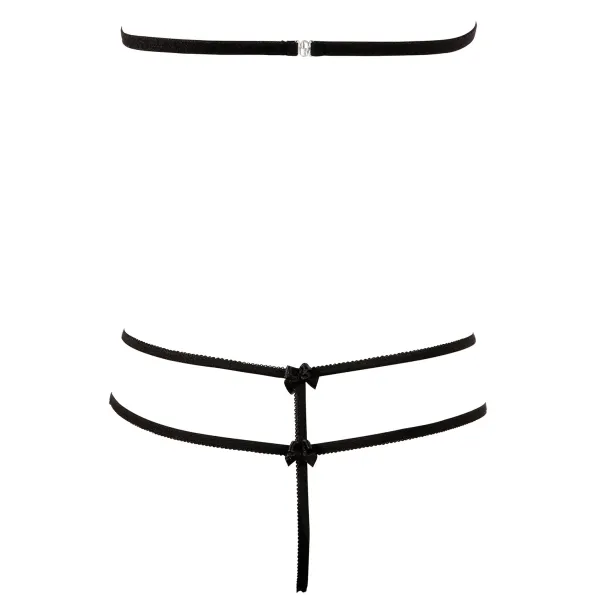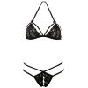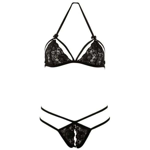 Cet ensemble sensuel ne laisse rien à désirer : Délicat soutien-gorge souple en dentelle florale noire. Les bonnets pouvant être ouverts. Les bretelles sont réglables. Le string est ouvert à l'entrejambe, il est doté de rubans satinés, sur l'arrière, pour un look sexy.