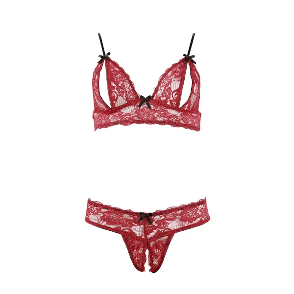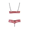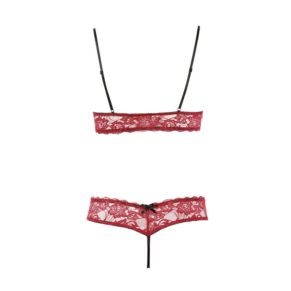 Dentelle et séduction ! avec cet ensemble rouge en dentelle florale. Composé de son Soutien-gorge souple avec bonnets ouverts et bretelles réglables. String ouvert, à l'entrejambe, assorti. Avec de délicats petits nœuds noirs décoratifs pour sublimer l'ensemble.