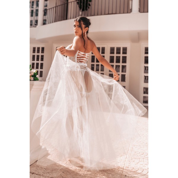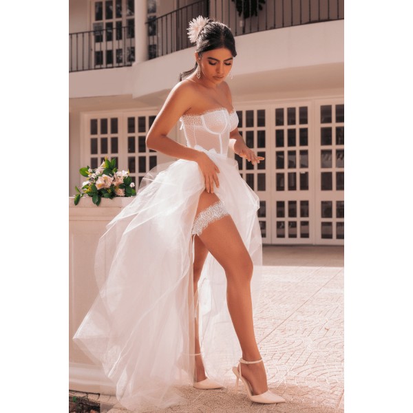 Découvrez cet ensemble 4 pièces d'une élégance rare, où romance et sensualité se rencontrent. Composé d'un bustier long, d'un string assorti et de jarretières délicates, il est confectionné en résille blanche transparente, sublimée par des finitions en dentelle à cils. Un laçage corset au dos du bustier ajoute une touche de séduction irrésistible.