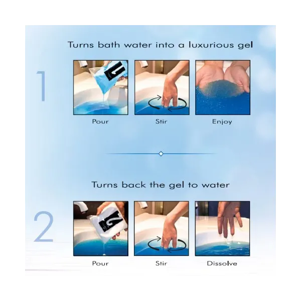 Versez le contenu du premier sachet dans la baignoire en faisant couler de l'eau très chaude. Sous vos yeux et en quelques minutes, l'eau chaude se métamorphosera en millier de délicates petites perles gonflées d'eau.