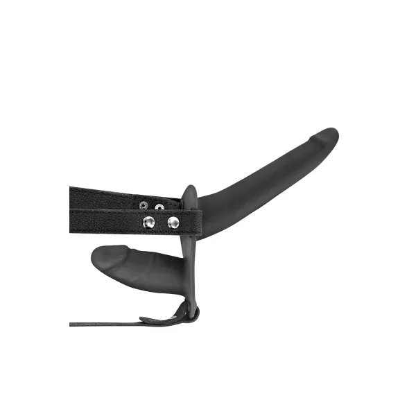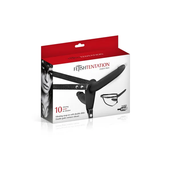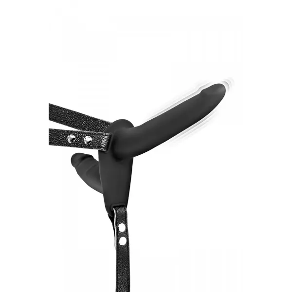 La ceinture est en simili cuir, elle est ajustable. Ce double gode noir vibrant est muni de 10 vitesses.