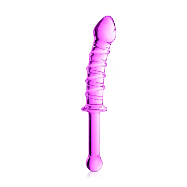 Laissez-vous tenter par l'élégance et les sensations uniques de ce gode en verre rose strié avec poignée. Un accessoire de plaisir raffiné pour explorer de nouvelles dimensions de votre sensualité.