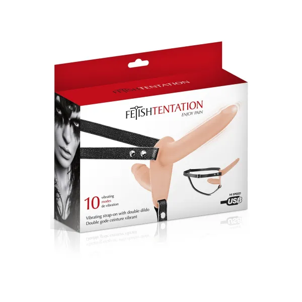 Pour des jeux érotiques saphiques ou hétéro, voici un double gode ceinture chair et vibrant qui sera porté par une femme. Pourquoi ? Tout simplement parce que ce double gode ceinture vibrant chair est équipé d'un gode principal pour pénétrer le ou la partenaire et d'un gode interne pour celle qui le porte. Les mouvement profiterons donc aux deux personnes. Le harnais est en simili cuir noir est parfaitement ajustable. Avec cette double stimulation, pourquoi ne pas en ajouter une troisième. C'est exactement le cas car ce modèle est vibrant et se recharge sur USB