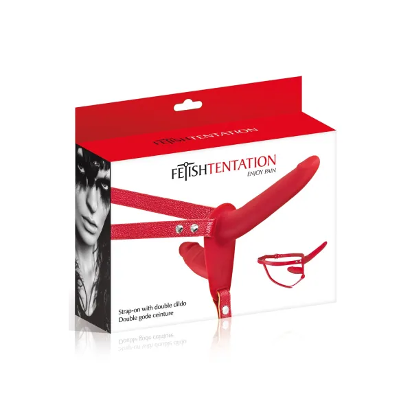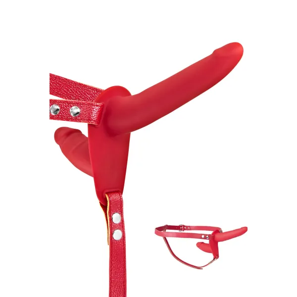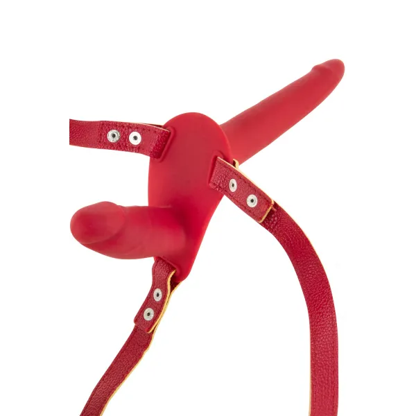 Pour des jeux érotiques saphiques ou hétéro, voici un double gode ceinture rouge qui sera porté par une femme. Pourquoi ? Tout simplement parce que ce double gode ceinture est équipé d'un gode principal pour pénétrer le ou la partenaire et d'un gode interne pour celle qui le porte. Les mouvement profiterons donc aux deux personnes. Le harnais est en simili cuir et parfaitement ajustable.