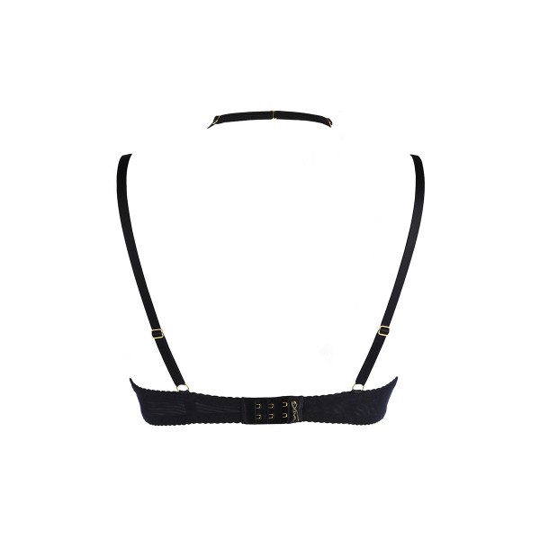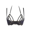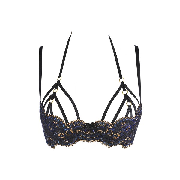 - Soutien-gorge à bonnets ouverts en tulle noir et broderies bleu et doré