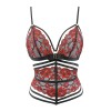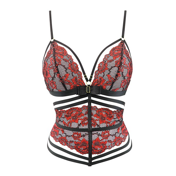 Soutien-gorge triangle prolongé d'un serre taille somptueux en dentelle noire et rouge.